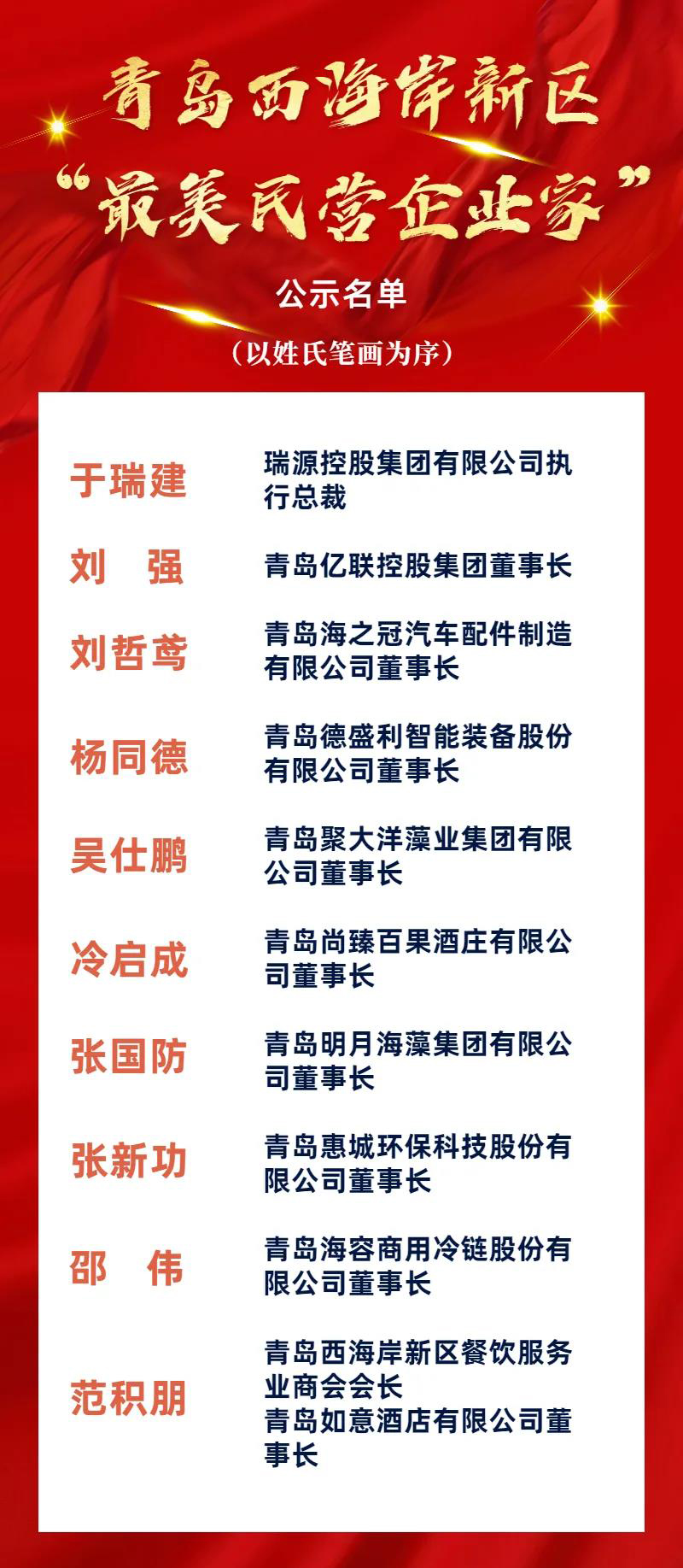 近日,工委區(qū)委統(tǒng)戰(zhàn)部、工委區(qū)委宣傳部、區(qū)工商業(yè)聯(lián)合會(區(qū)民營經(jīng)濟發(fā)展局)聯(lián)合開展青島西海岸新區(qū)“最美民營企業(yè)家”評選活動。經(jīng)過廣泛宣傳發(fā)動、優(yōu)秀典型推薦、綜合評價、聯(lián)合評分等程序,評選出10名青島西海岸新區(qū)“最美民營企業(yè)家”,青島惠城環(huán)保科技股份有限公司董事長、總經(jīng)理張新功入選。